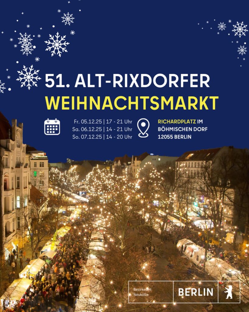 Eröffnet wird der Alt-Rixdorfer Weihnachtsmarkt am Freitag, den 5. Dezember um 17.00 Uhr durch Bezirksbürgermeister Martin Hikel.